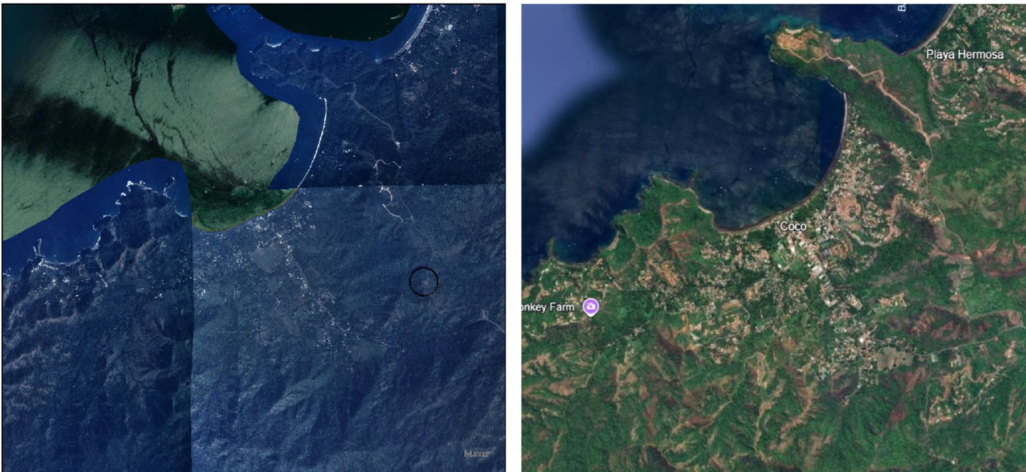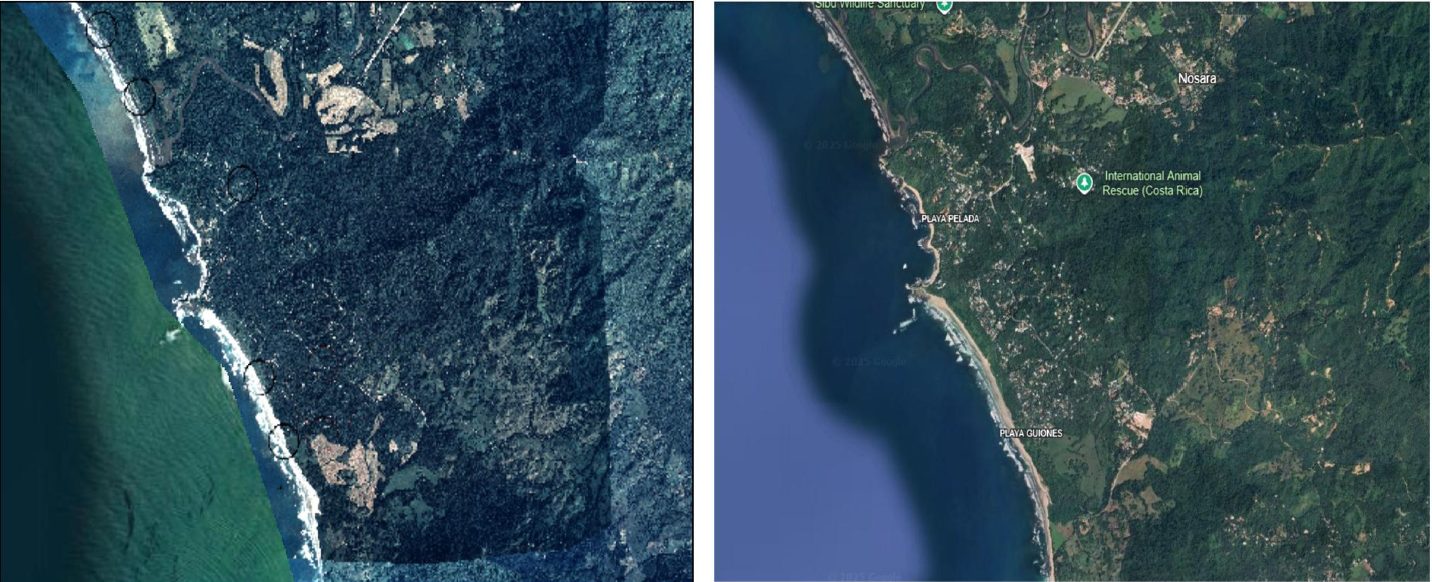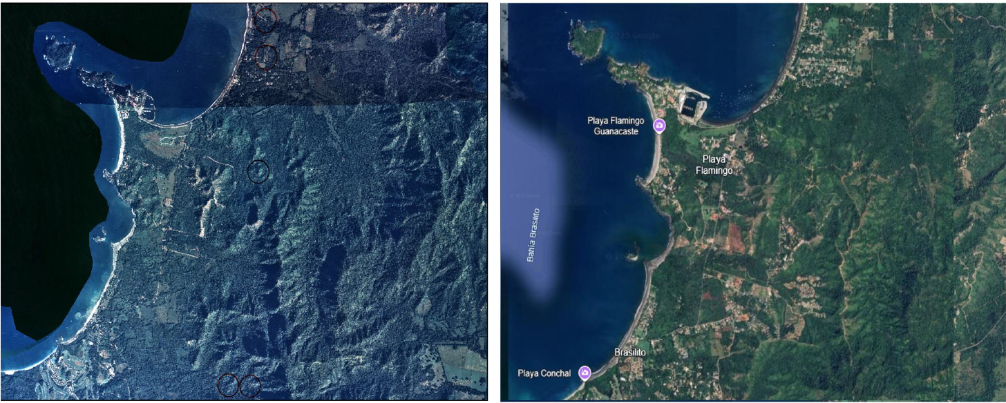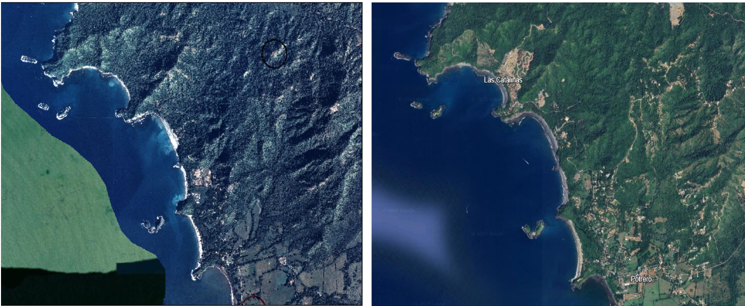 La zona de Playas del Coco, muestra una marcada transformación del uso del suelo. Este sector presentaba una cobertura boscosa y vegetación secundaria, y pasa a una amplia expansión urbana y turística. Las imágenes evidencian la sustitución de áreas cubiertas por árboles y arbustos por infraestructura residencial, comercial y vial. Tal sustitución ha generado una fuerte fragmentación del paisaje natural. Se observa el cambio de coberturas de vegetación leñosa hacia un suelo construido, como consecuencia de un proceso de urbanización acelerada, y con efectos de pérdida de cobertura vegetal.