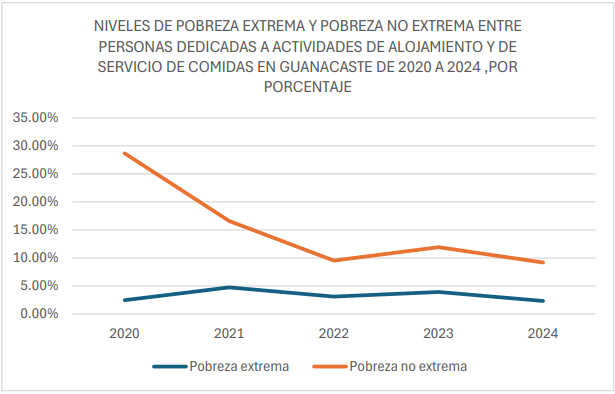 Figura 1. Nivel de pobreza extrema y no extrema entre las personas ocupadas en actividades de alojamiento y servicios de comidas en Guanacaste, 2020-2024 por porcentaje y en forma de gráfico. Elaboración propia a partir de datos del INEC.