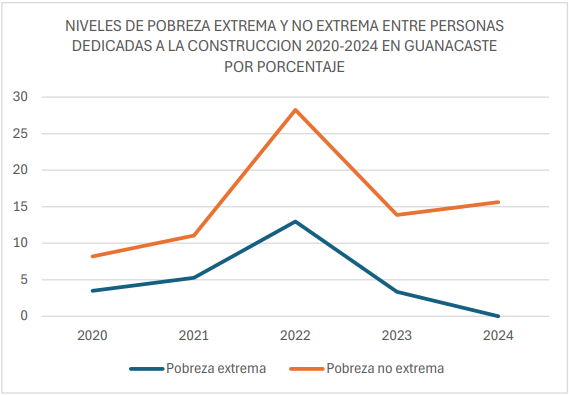 Figura 3. Porcentajes de pobreza extrema y no extrema entre personas dedicadas a la construcción en Guanacaste, 2020-2024. Fuente, elaboración propia a partir de datos del INEC